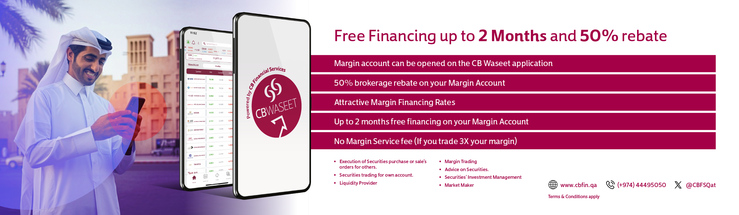 Competitive Interest Rates – CBFS provides a 0% interest rate for the first month. After that, a service fee will apply on the financed amount, calculated at the QCB lending rate plus up to 2% per annum. This rate is subject to adjustment by the company, with customer and QFMA approval. Importantly, if you do not utilize the margin amount provided by CBFS, no interest will be charged. Terms & Conditions apply.